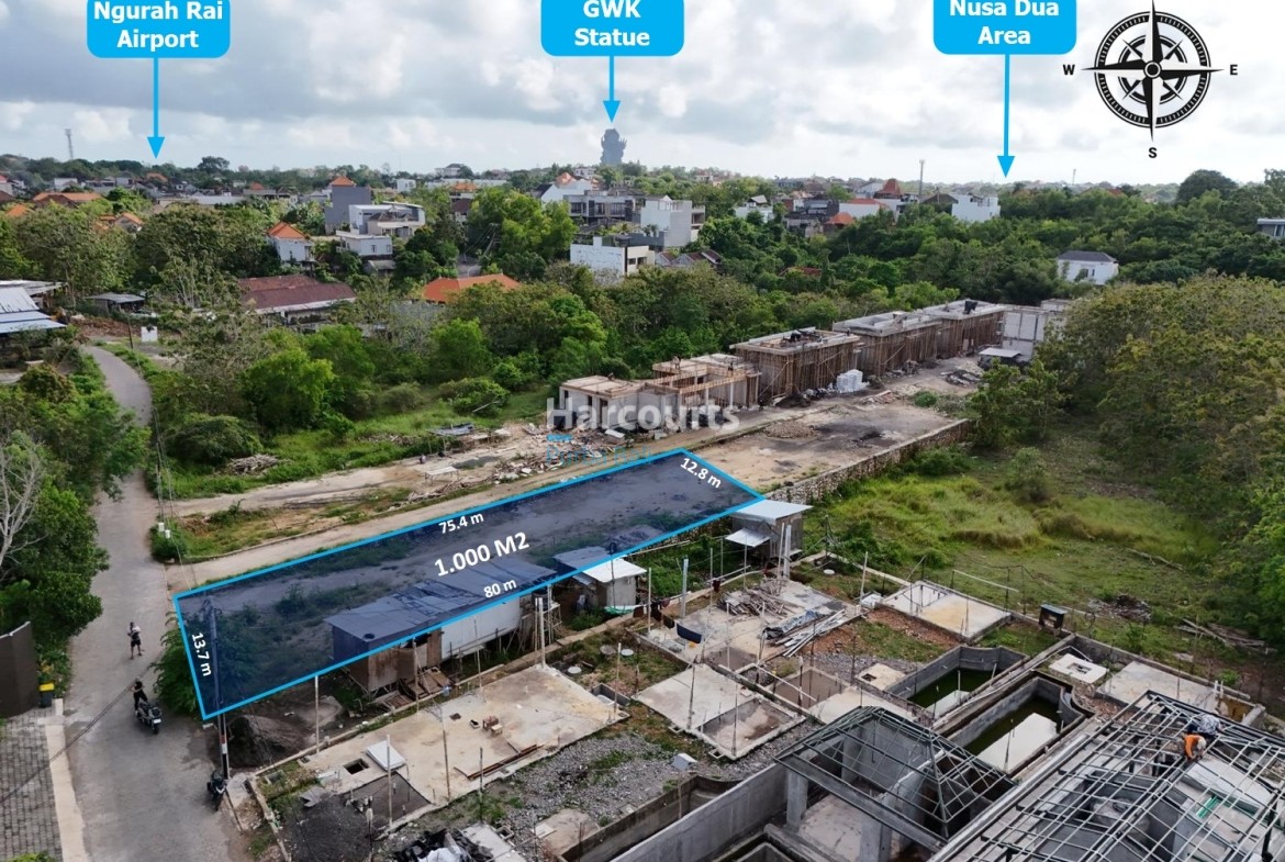Ungasan — a premium leasehold parcel offering a rare blank canvas for a private luxury estate or commercial villa development, prominently defined by its flat, ready-to-build topography. The land totals 10 are (1,000 m²) and is offered on Leasehold (Hak Sewa) — nearly 30 years remaining, with a 20-year extension option already in place, providing secure long‑term holding potential.