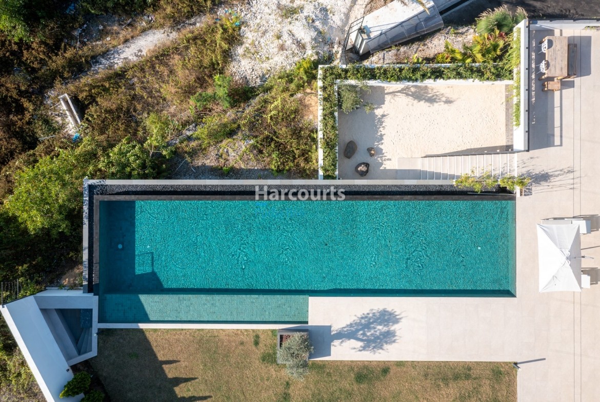 Set on a 16-are (1,600 m²) hillside estate, the villa features secure private access, beautifully landscaped gardens, and a white perimeter wall ensuring complete privacy. Its multi-level modern architecture, flat roof with solar panels, and extensive outdoor lounging areas perfectly complement the tropical surroundings.