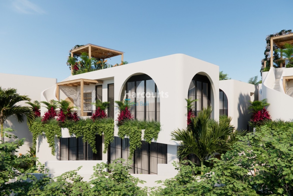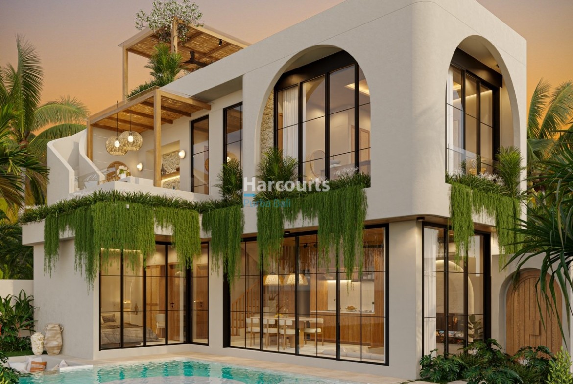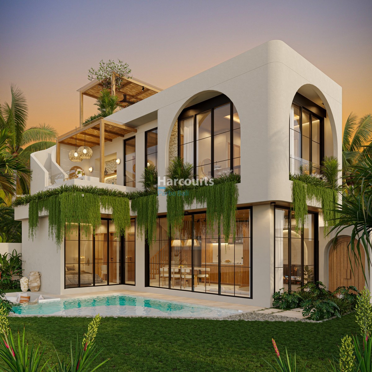 The villas embrace a soft, Mediterranean-inspired aesthetic with arched façades, cascading greenery, and floor-to-ceiling glass that opens to beautifully appointed outdoor areas. The three-bedroom villa maximizes its vertical space with a rooftop lounge, first-floor terrace and bar, and lush courtyard anchored by a curved private pool, floating sunbed, and outdoor shower. Warm materials, custom lighting, and thoughtful proportions ensure each corner of the home feels both elegant and highly usable.