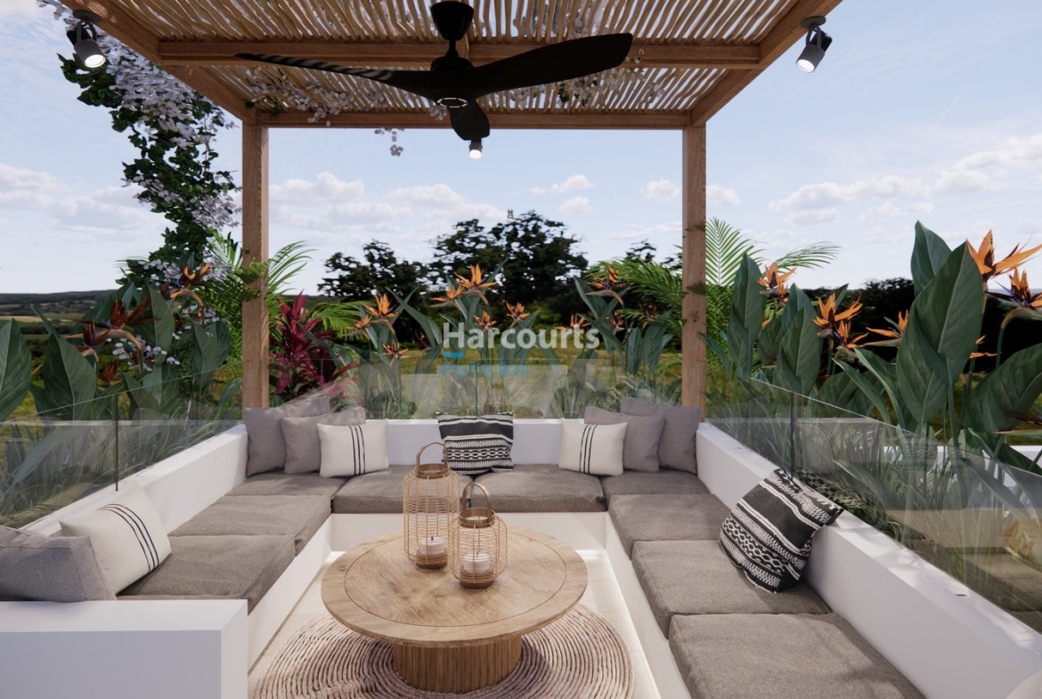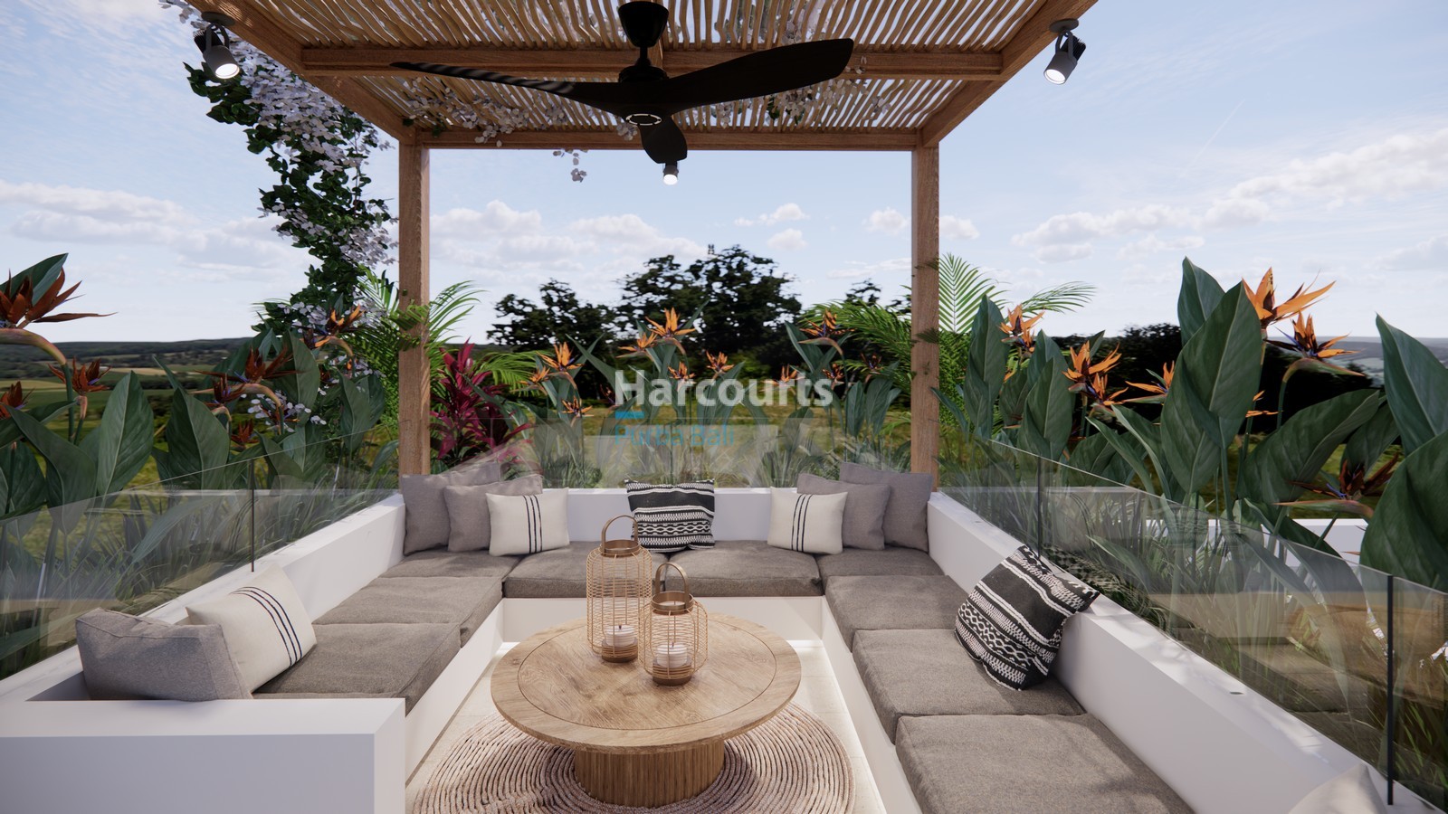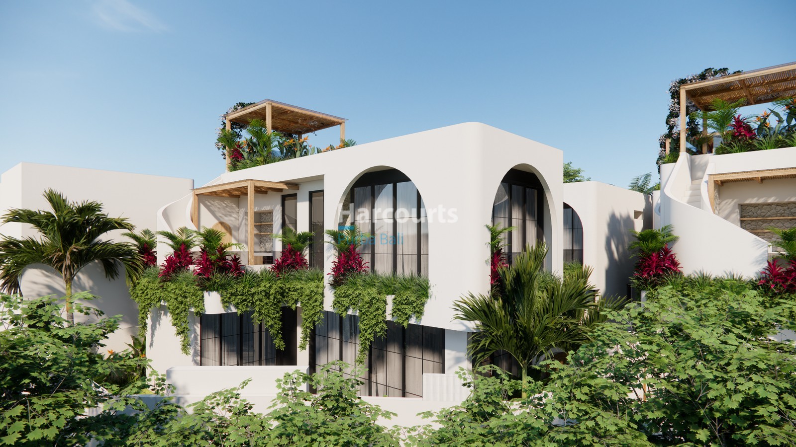 The villas embrace a soft, Mediterranean-inspired aesthetic with arched façades, cascading greenery, and floor-to-ceiling glass that opens to beautifully appointed outdoor areas. The three-bedroom villa maximizes its vertical space with a rooftop lounge, first-floor terrace and bar, and lush courtyard anchored by a curved private pool, floating sunbed, and outdoor shower. Warm materials, custom lighting, and thoughtful proportions ensure each corner of the home feels both elegant and highly usable.