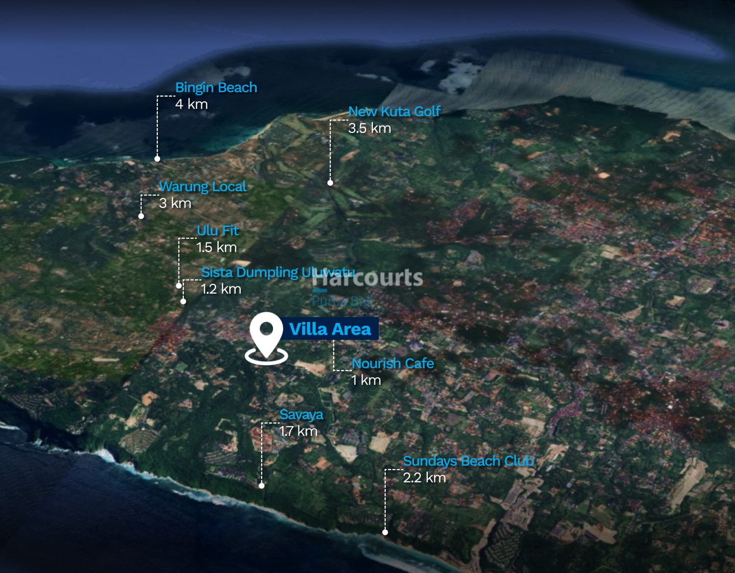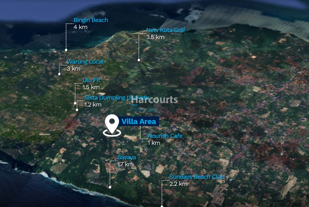 Nearby: Nourish Cafe 1 km, Sista Dumpling Uluwatu 1.2 km, Ulu Fit 1.5 km, Savaya 1.7 km, Sundays Beach Club 2.2 km, Warung Local 3 km, New Kuta Golf 3.5 km, Bingin Beach 4 km