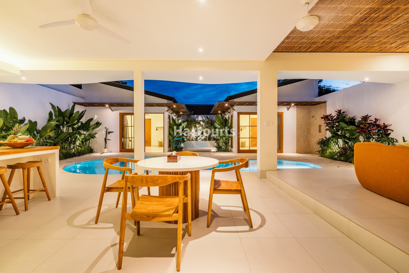 Inside, a 94 m² open-plan living area flows naturally from kitchen to lounge and poolside terraces. The kitchen is finished with warm wooden cabinetry and a wooden countertop, a patterned backsplash and modern appliances; large glass doors and a timber-finished ceiling bring abundant natural light and evening ambience into the space. Thoughtful furnishings — a substantial brown sofa, a round dining table with green accent chairs and indoor plants — reinforce the villa’s calm, tropical aesthetic while three ensuite bedrooms provide privacy for guests.