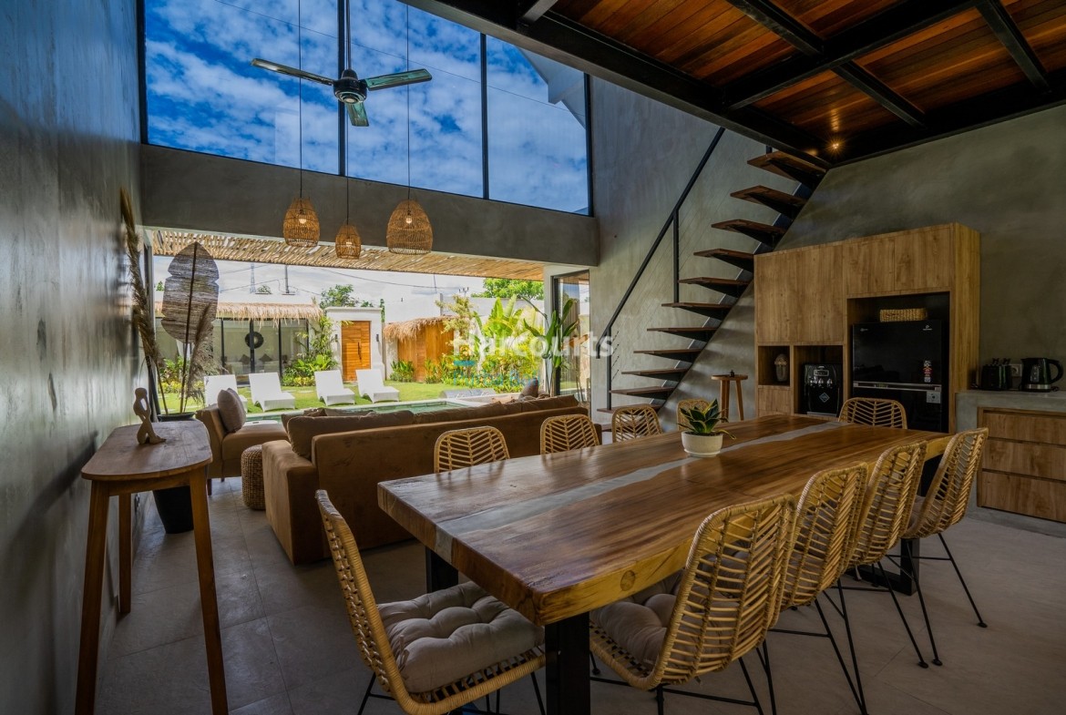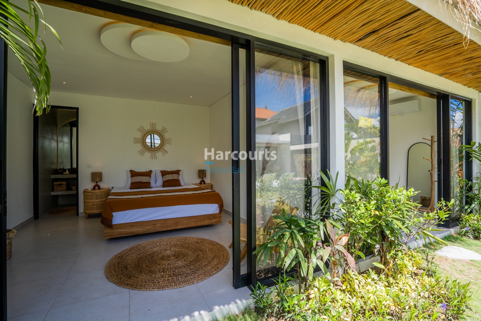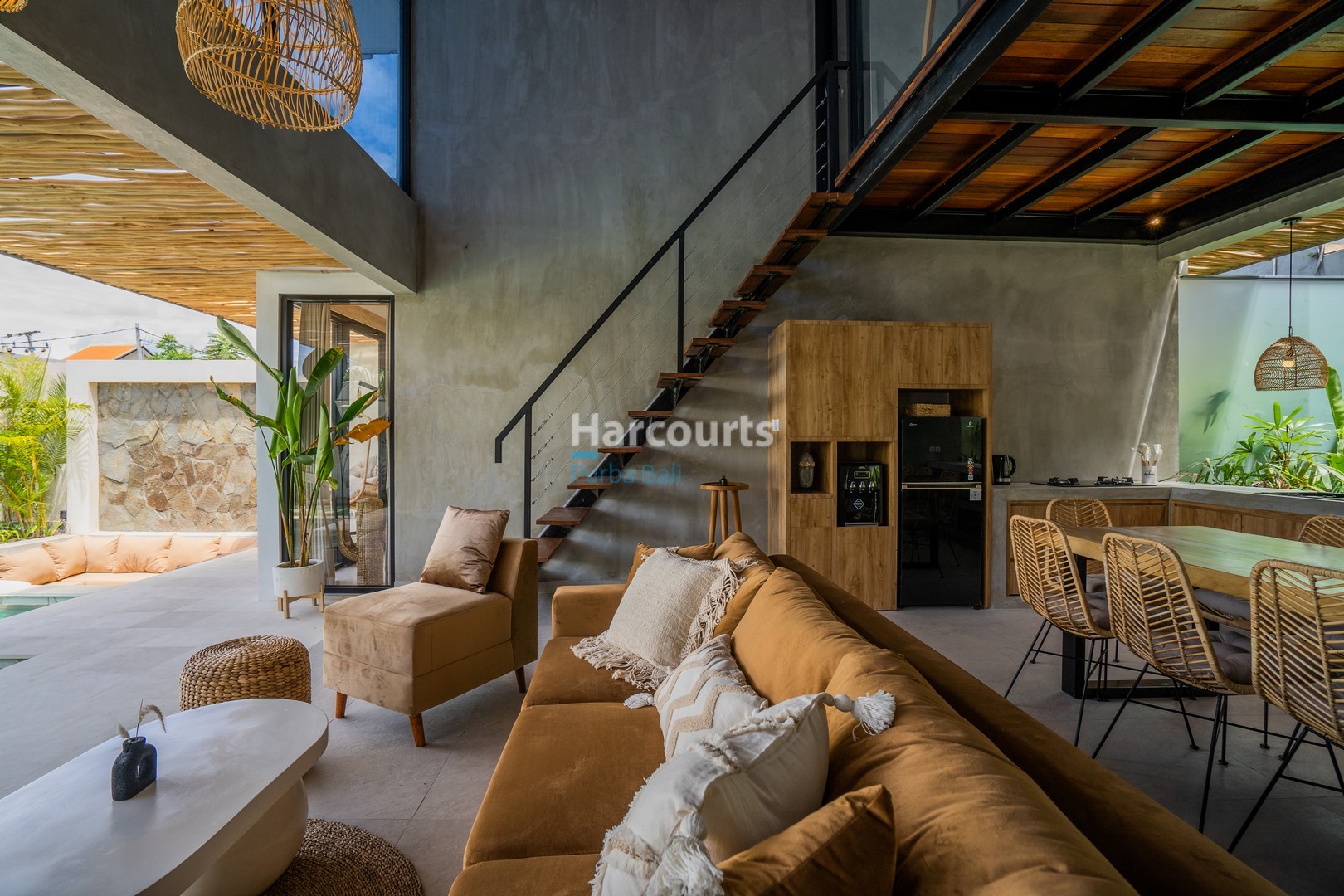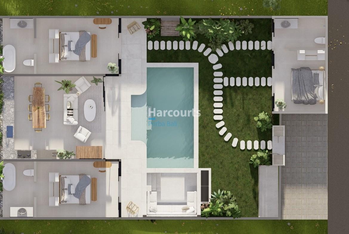Covering 280 sqm of land this fully-furnished, villa is part of a 9-villa estate and consists of 4 bedrooms with 3 ensuite bathrooms, built-in wardrobes, a tropical-style open living room including a dining area and a modern kitchen on a total property size of 160 sqm. 2 bedrooms flank the living area, the third can be found on the second level mezzanine while the guest bedroom occupies its own building at the other end of the garden giving guest privacy from the main house. The 3m x 6m swimming pool is set in a tropical landscape garden and comes with its own sunken lounge and bbq area. The villa also has a carport.