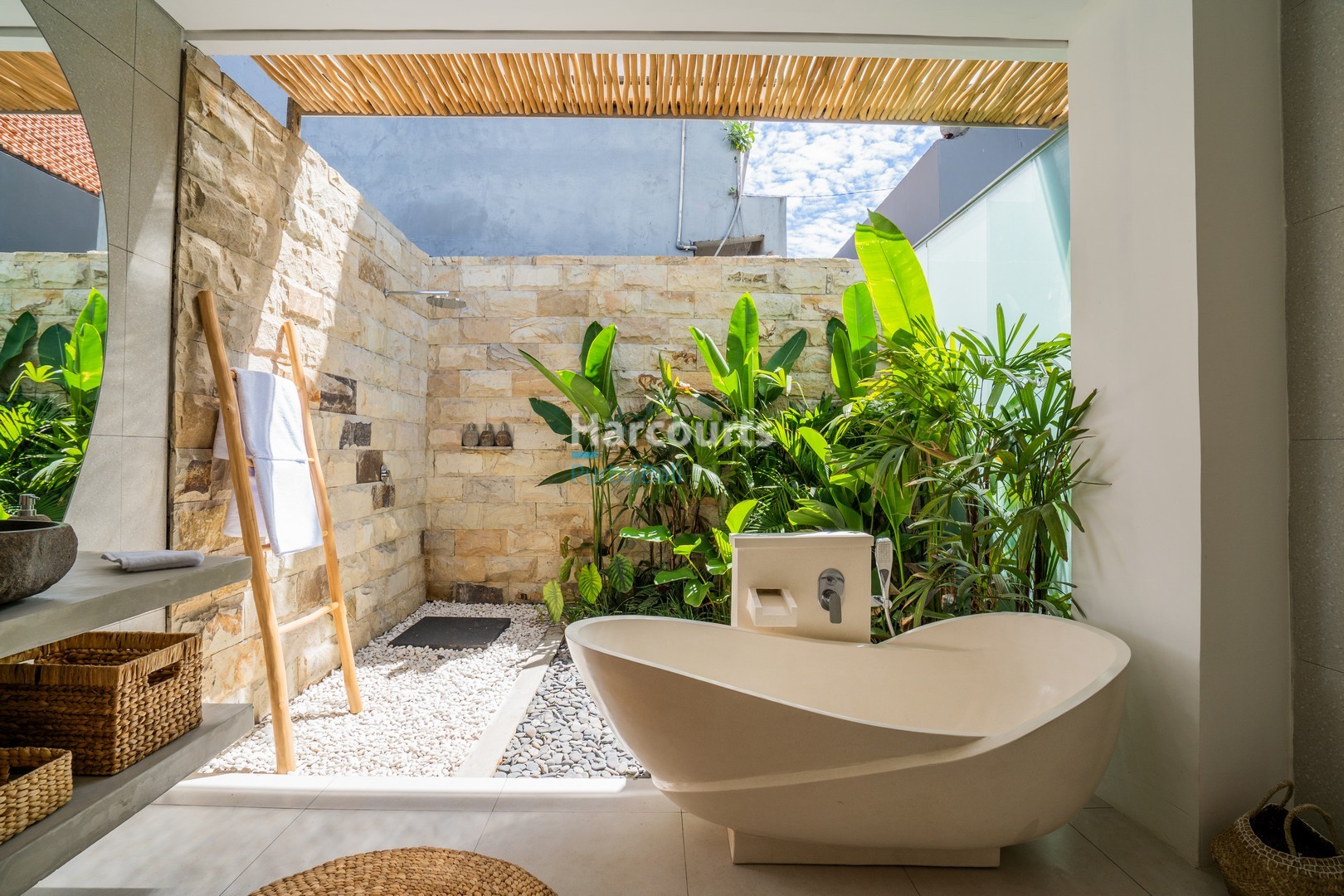The south facing property is conveniently located in a quiet Kerobokan area yet close to many essential facilities like shops, restaurants, supermarkets and hospitals. Families choose this area because of the variety of international schools in close proximity. Both Berawa and Batu Belig beaches are not far away.